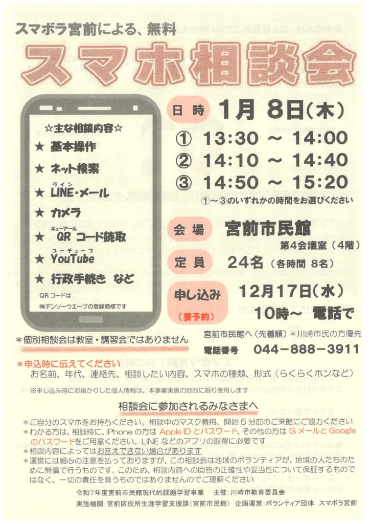 ◆パソコン・スマホ操作に意欲ある川崎市在住・在勤・在学のいずれかの40歳以上の方 。 ◆申込は、FA […]