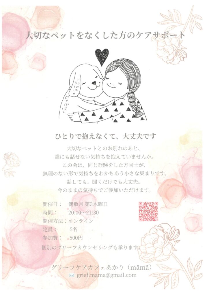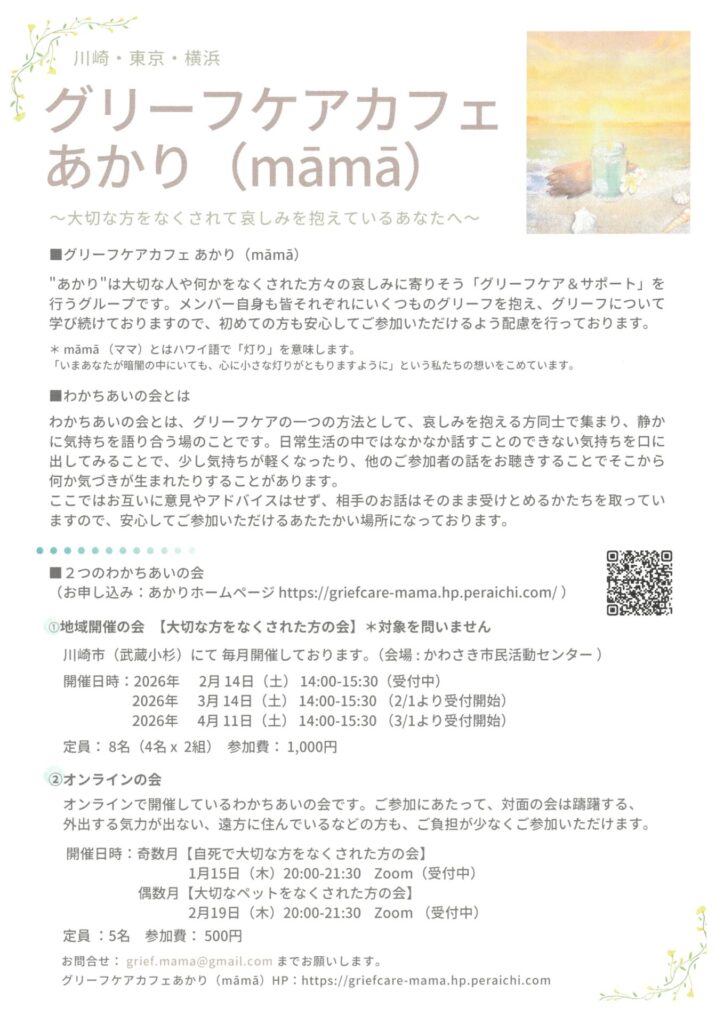 定員:5名 参加費:500円 個別のグリーフカウンセリングも承ります。 問合せ:グリーフケア カフェ […]