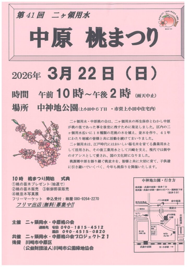 桃の苗木プレゼント(抽選で) 桃の苗木販売 新鮮野菜販売 桃並木写真展 フリーマーケット(出店募集中 […]