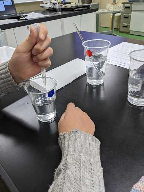 塩化カルシムを水に溶かす際に手をコップに当ててみました。子どもたちは化学反応で熱が出てコップが温かくなるのを感じ、驚いた様子でした。