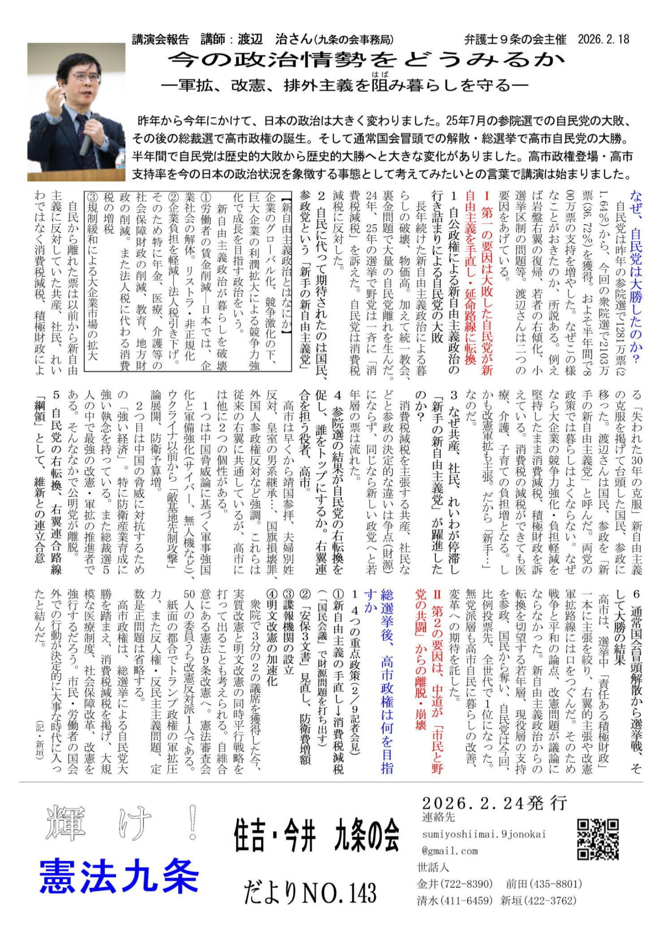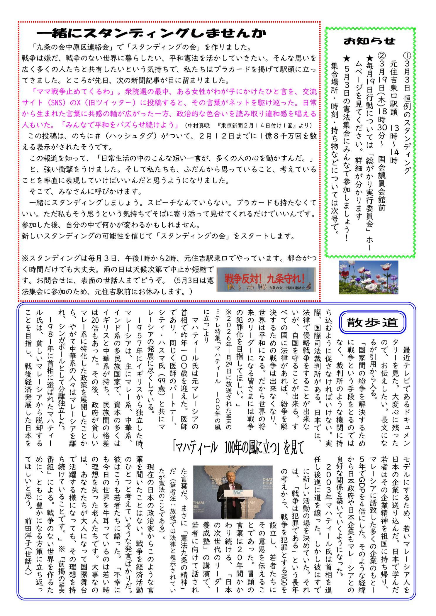 「だより143号」の表面は、2026年2月18日に開催された、渡辺治さん(九条の会事務局)の講演会の報告です。新政権の今の政治状況をどう見ているのでしょうか。裏面は、この度立ち上げた「スタンディングの会」の紹介と参加のお誘いです。SNSのXでバズッタ「ママ戦争止めてくるわ」の一言。平和を愛する当たり前の気持ちを一緒に表現してみましょう。コラム「散歩道」はNHKで最近放映された「マハティール100年の風に立つ」見て感じたことをお伝えしています。憲法九条の精神は、日本だけのものではないと改めて知りました。