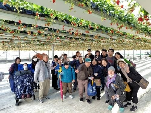 常磐道に入って守屋サービスエリアで休憩した後、渋滞に巻き込まれることもなく、予定時間より早く「グランベリー大地」に到着しました。綺麗に整備されているいちご園で、いくつかの大きなハウスに分かれています。昨年も参加された会員さんが多く、指定された棟に迷うことなく入っていきました。