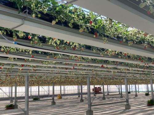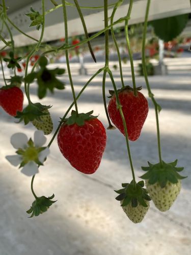 ハウス内は、いちご棚が天井から高い位置に下がっているリフト式で、全てのいちご棚が高い位置にある景色は、広くて壮観でした。しかも1棟貸し切りなので、ますますテンションが上がります。バスの中でいちご狩りについての注意点などが説明されたDVDを事前に観ていたのですが、改めてスタッフからの説明を受けていると、いちご棚がゆっくりと降りてきました。棚の高さは自由に変えられるので、手に取りやすい高さにいちごがくるようにセットしてくださいました。棚が地面にないので、平らでとても歩きやすかったです。