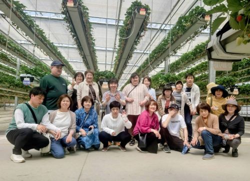 グランベリー大地では、「飛び上がっていちごを取るのよ」と冗談を言いながら、いちご棚が下りてくるのをじっと見守りました。5種類のいちごを自由に食べていいということで、OKの合図とともに皆さん一斉に摘み始めました。それぞれ好みもありますが、一番人気はやよいひめでした。何個食べたのかはわかりませんが、お腹をさすりながら満足したようすでした。