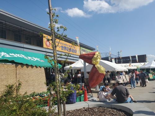 お腹いっぱいいちごを食べた後は「道の駅常総」です。まずはお買い物をとかご一杯にお土産を買っていました。きゅうりの詰め放題に挑戦した方や、人気のメロンパンの行列に果敢にチャレンジしゲットされた方もいます。昼食は各自で好きなものを食べることにしていたので、レストランや食堂で食べる人、テイクアウトのお弁当やおむすびを買って、デッキで食べる人など自由に楽しみました。