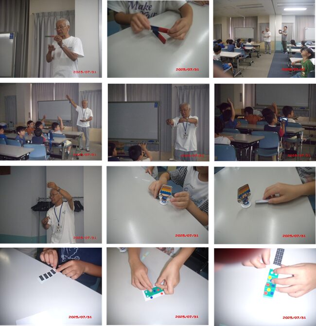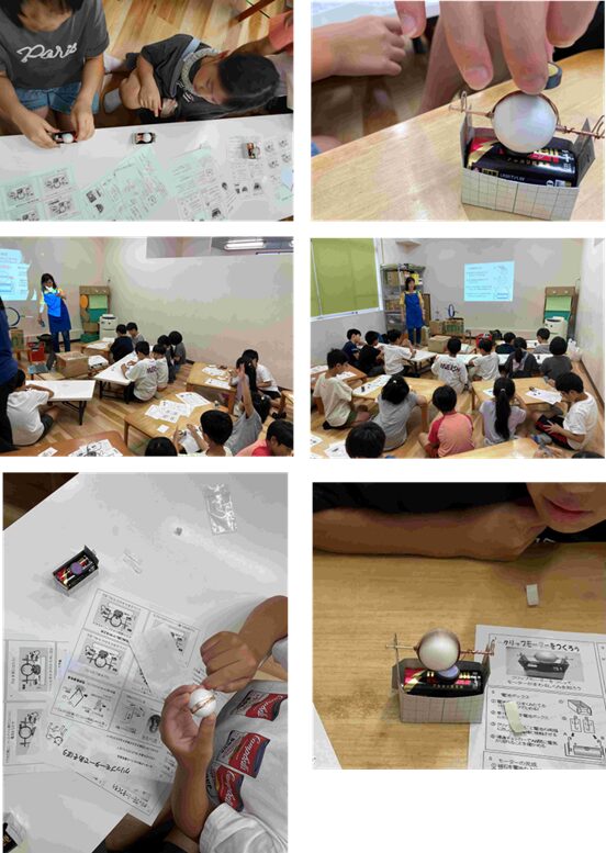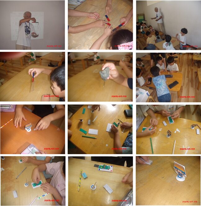 7月29日(火)よつばクラブ1年生に「磁石で動かそう」、31日(木)よつばクラブ2年生に「磁石で動かそう」、8月1日(金)よつばクラブ3~6年生に「クリップモータを作ろう」の出前実験教室を行いました。