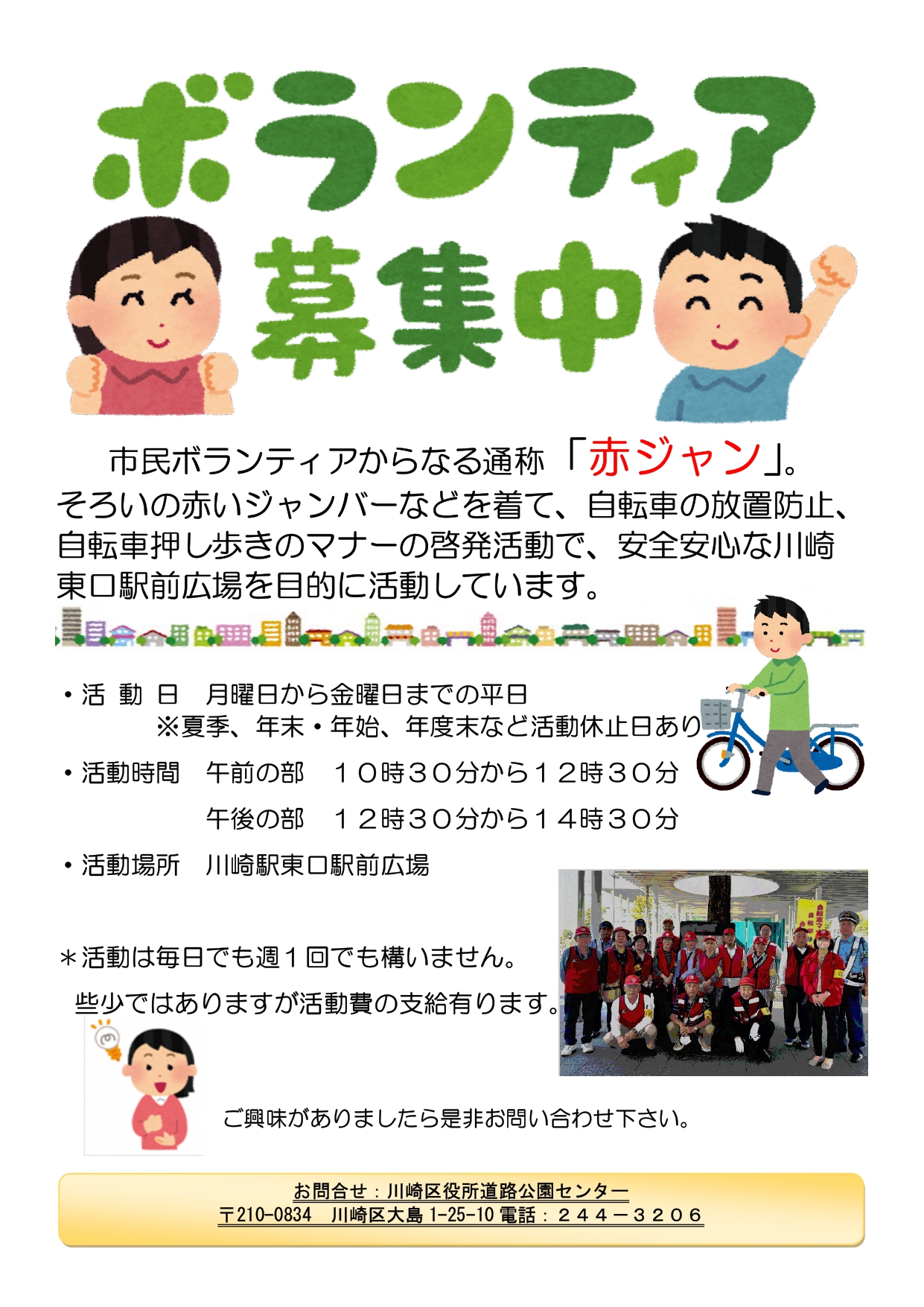 市民ボランティアからなる通称「赤ジャン」。 そろいの赤いジャンバーなどを着て、自転車の放置防止、自転...