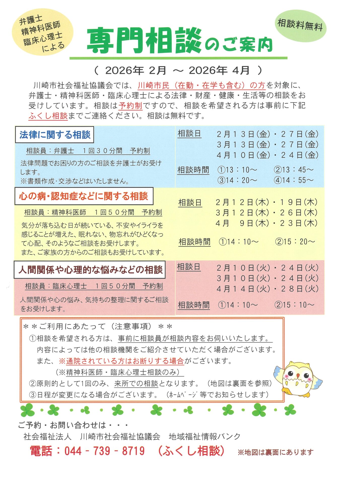 弁護士 精神科医師 臨床心理士による 専門相談のご案内(2026年2月~2026年4月)