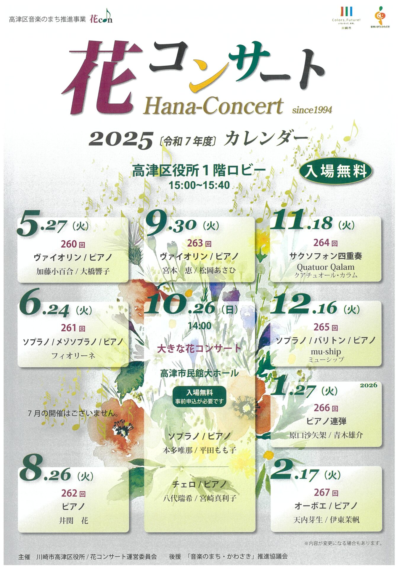 高津区音楽のまち推進事業「花コンサート」2025カレンダー