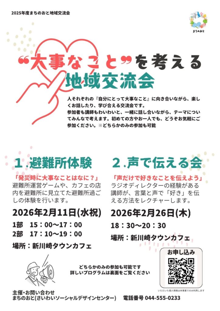 新しい出会いを楽しむ地域交流会。今年度は、2つの企画を通じて『自分にとって大事なこと』をテーマに、楽しくお話したり、学び合います。初めての方やお一人でも、どうぞお気軽にご参加ください!