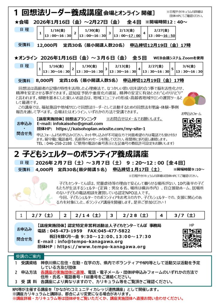 【問い合わせ】チラシ裏面記載の各講座実施団体連絡先へ直接ご連絡下さい。