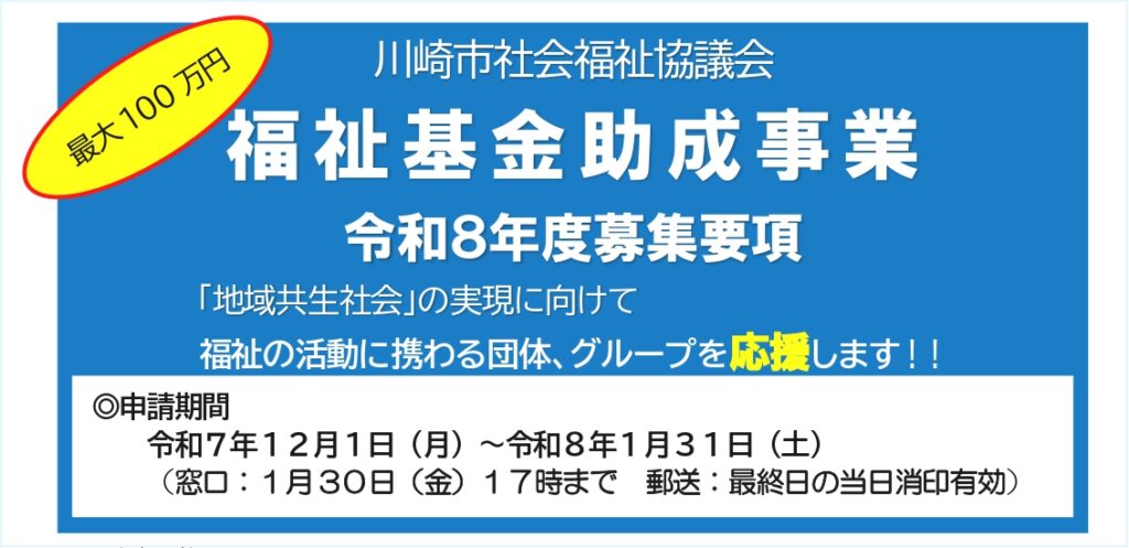 申請を希望される団体は必ず川崎市社会福祉協議会福祉基金助成事業 令和8年度募集要項等をご確認のうえお申し込みください。