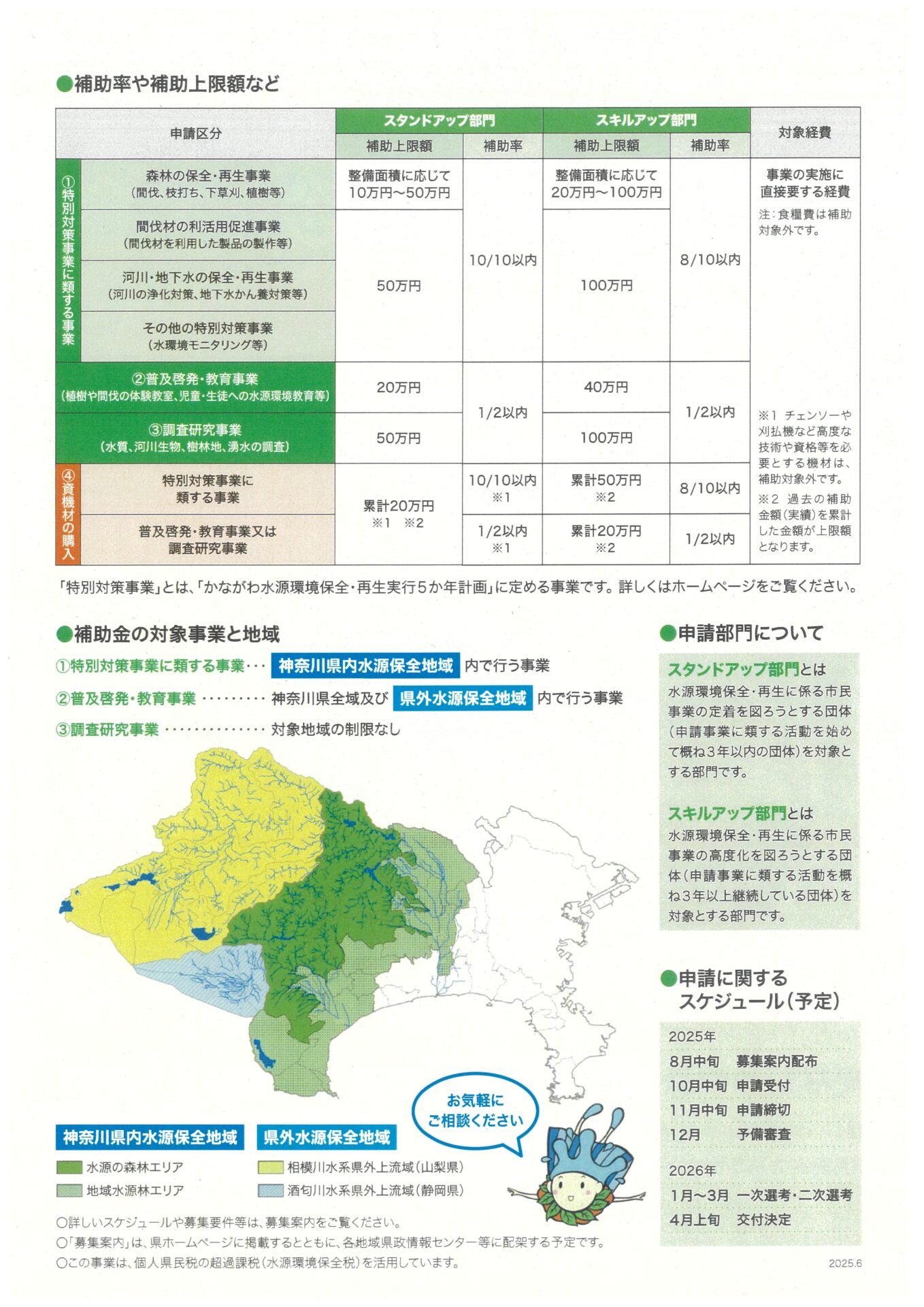 - 水源保全地域での活動に限らず、横浜、川崎など水源保全地域以外で実施する普及啓発・教育事業も補助対象となります。
