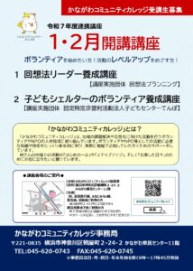 「かながわコミュニティカレッジ」は、地域の課題解決や活性に向けた活動を行うボランティアやNPOの人材育成などの取り組んでいます。ボランティアやNPOなどの活動に必要な地域や技術をじっくり体系的に学んでいただき、実際に地域で活動していただくためのサポートをしています。それぞれの地域での活動の「はじめの一歩」や「ステップアップ」そして「充実した日々」のためにお役に立ちたいと願っています。