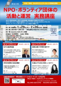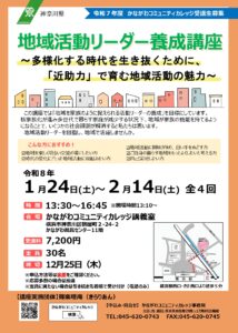 「かながわコミュニティカレッジ」は、地域の課題解決や活性に向けた活動を行うボランティアやNPOの人材育成などの取り組んでいます。ボランティアやNPOなどの活動に必要な地域や技術をじっくり体系的に学んでいただき、実際に地域で活動していただくためのサポートをしています。それぞれの地域での活動の「はじめの一歩」や「ステップアップ」そして「充実した日々」のためにお役に立ちたいと願っています。
