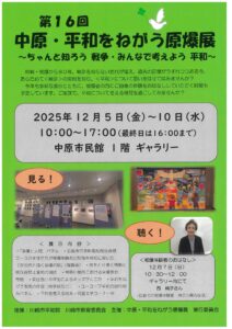 市民館ギャラリーにて、原爆展をおこない、原爆被爆の実相を伝える。また被爆者、医者のお話を聞く。