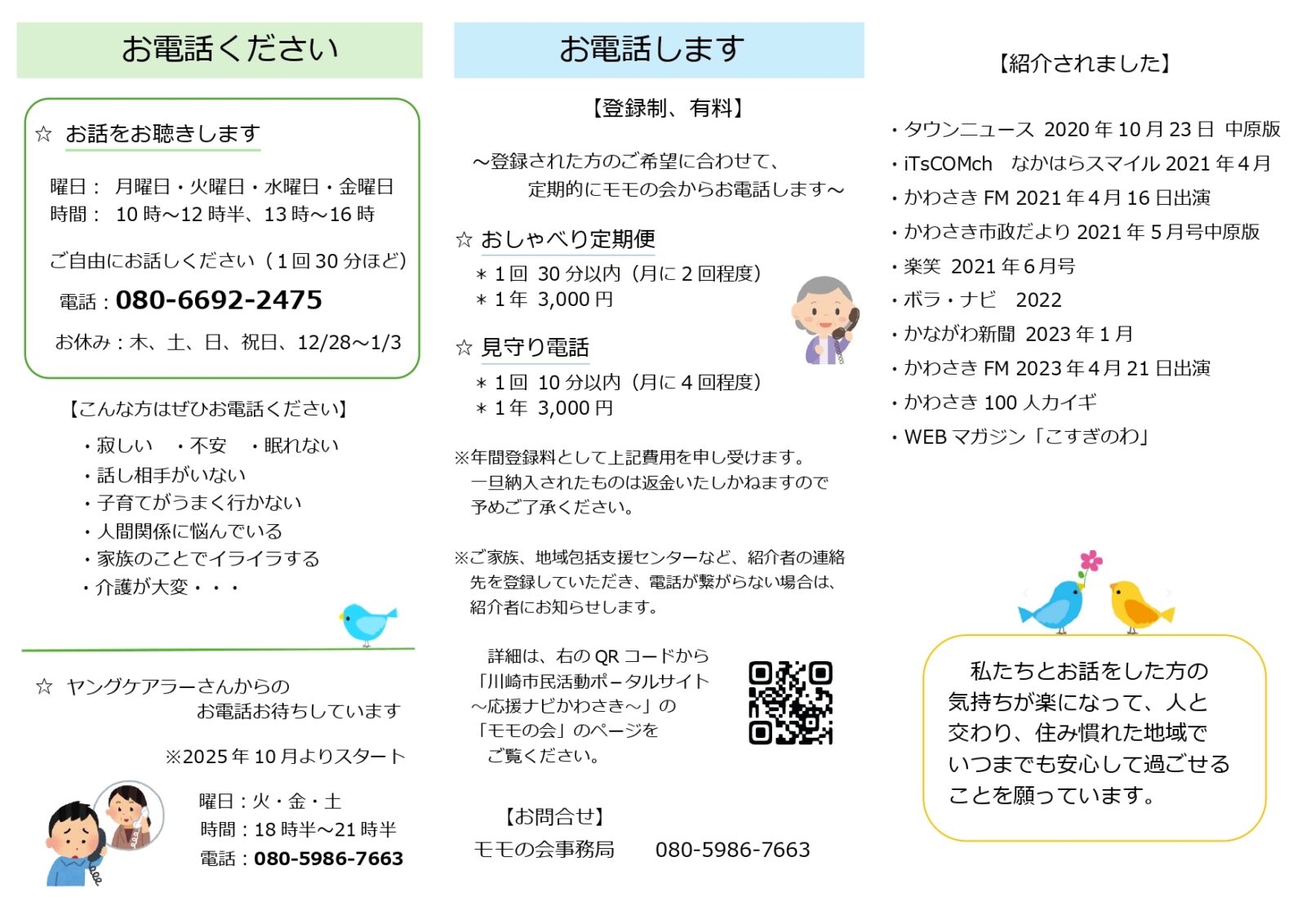 モモの会からおかけする電話については、登録制になりました。 一緒に活動してくださる方を、随時、募集中です。