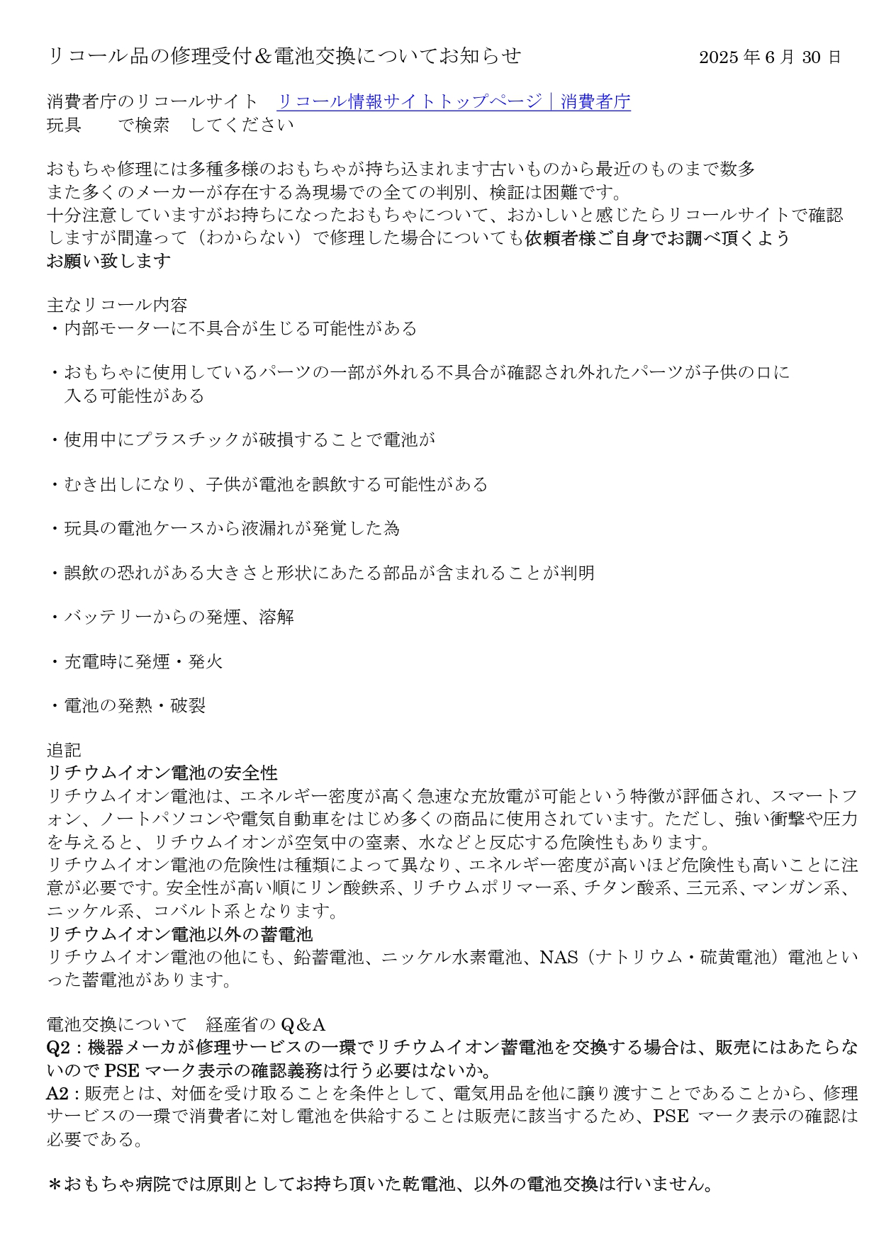 リコール品&電池交換の依頼者へのお知らせ