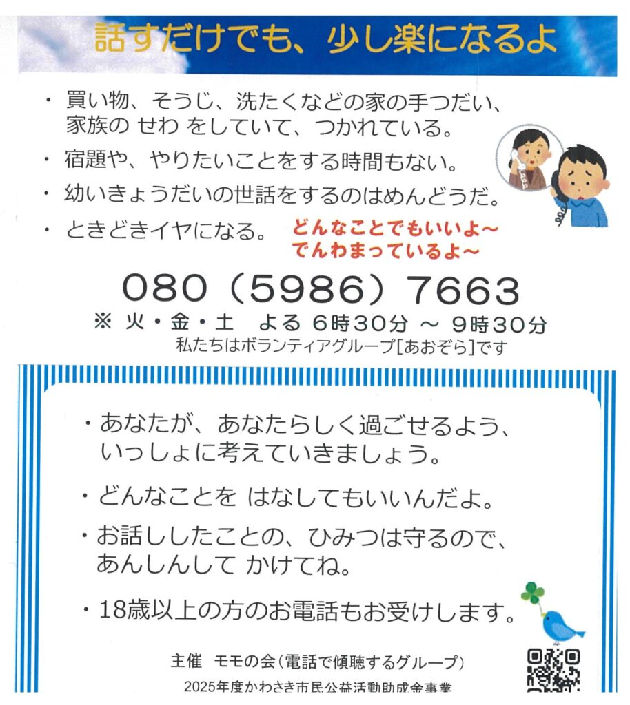 ・買い物、そうじ、洗たくなどの家の手つだい、家族のせわをしていて、つかれている。 ・宿題や、やりたいことをする時間もない。 ・幼いきょうだいの世話をするのもめんどうだ。 ・ときどきイヤになる。 どんなことでもいいよ~ でんわまっているよ~
