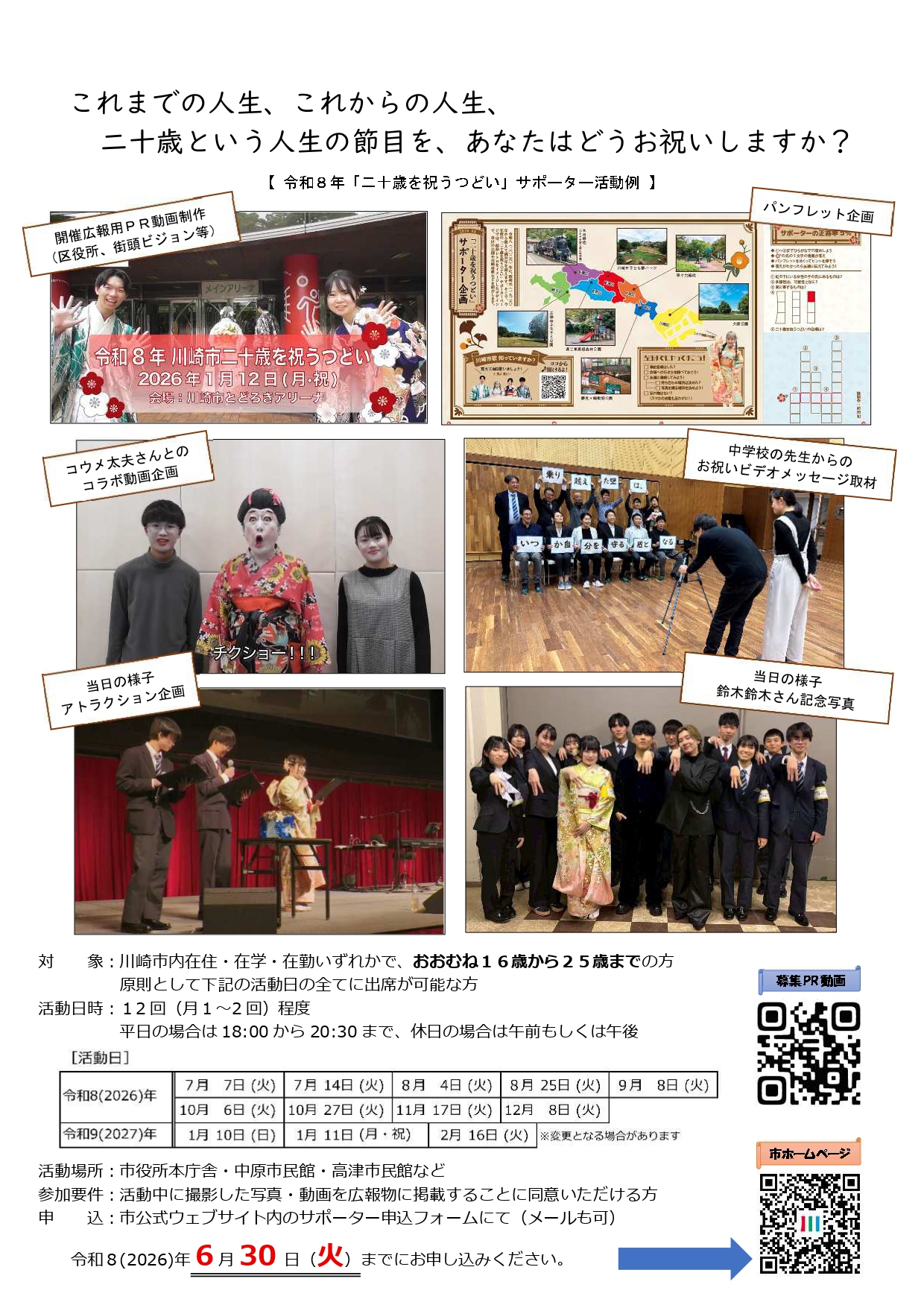 「二十歳を祝うつどい」サポーターの活動では、二十歳の方へのビデオメッセージ、開催広報用PR動画、パンフレットの制作などを行います。